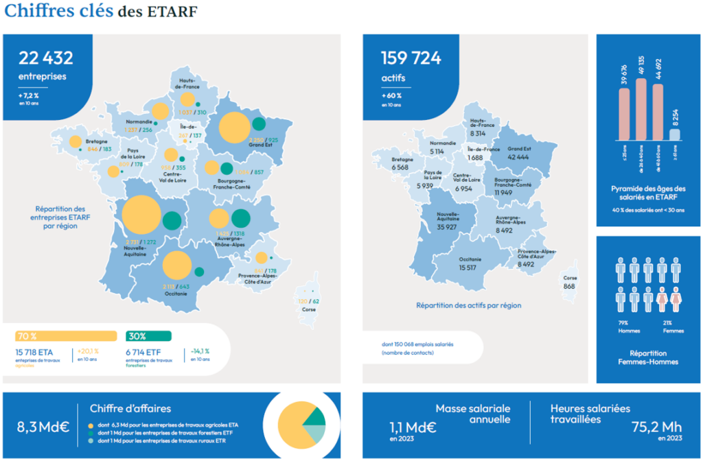 According to the latest census, there are nearly 22,000 ETARFs (french acronym) in France—agricultural, rural, and forestry work and service companies (Figure 3). These establishments are divided into nearly 15,000 agricultural work companies (ETA – those of interest to us in this report) and nearly 7,000 forestry work companies (ETF). The number of ETARFs increased by more than 7% between 2013 and 2023, an upward trend that masks significant disparities between ETAs and ETFs (+20% for ETAs, -14.4% for ETFs). Some of the ETAs (around 2,000) are affiliated with the FNEDT, the national federation of entrepreneurs of Territories. This total of 15,000 ETAs does not include the nearly 11,000 farmers who carry out custom work in their own name (Agreste, RA 2020).
