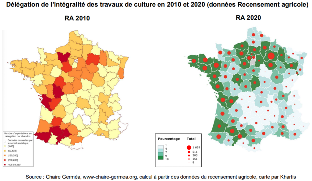 More broadly, the dynamics of delegating agricultural work via agricultural equipment are changing. While the number of agricultural tasks being delegated is increasing, the complete delegation of farm operations (used by nearly 7% of French farms) seems to be stabilizing. However, the figures are not always accurate and should sometimes be taken with a grain of salt.