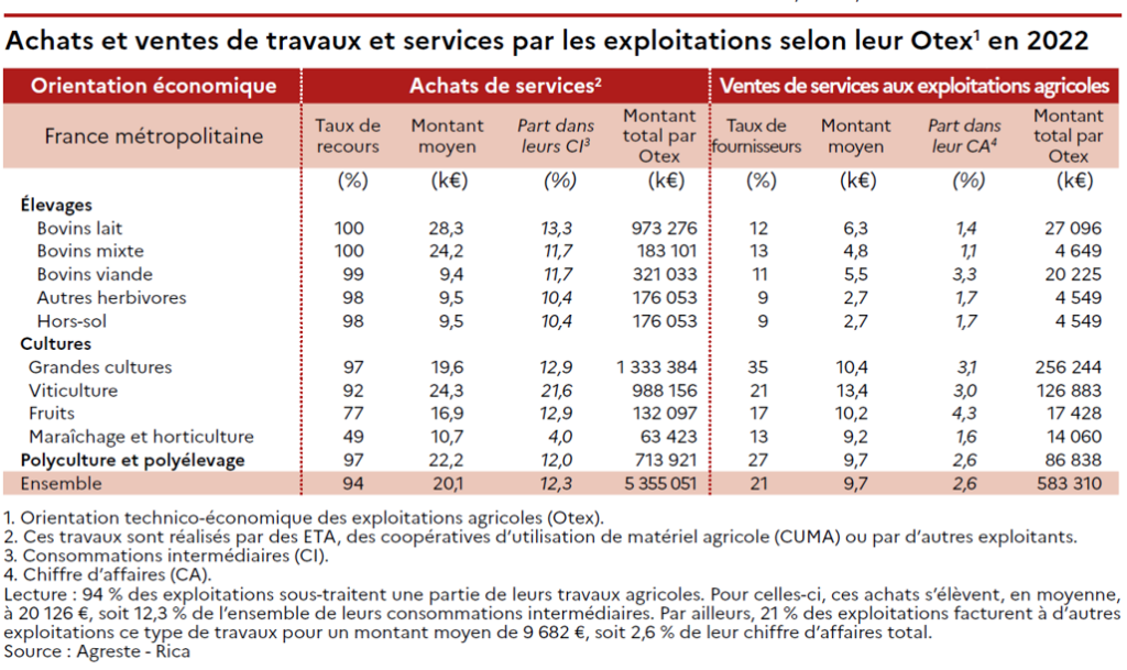 Table 1. Purchases and sales of work and services by farms according to their OTEX in 2022. Source: Agreste, RA 2020