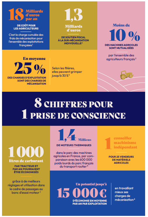 Figure 6. Eight figures providing an overview of the state of agricultural mechanization in France. Source: FNCUMA 2024.